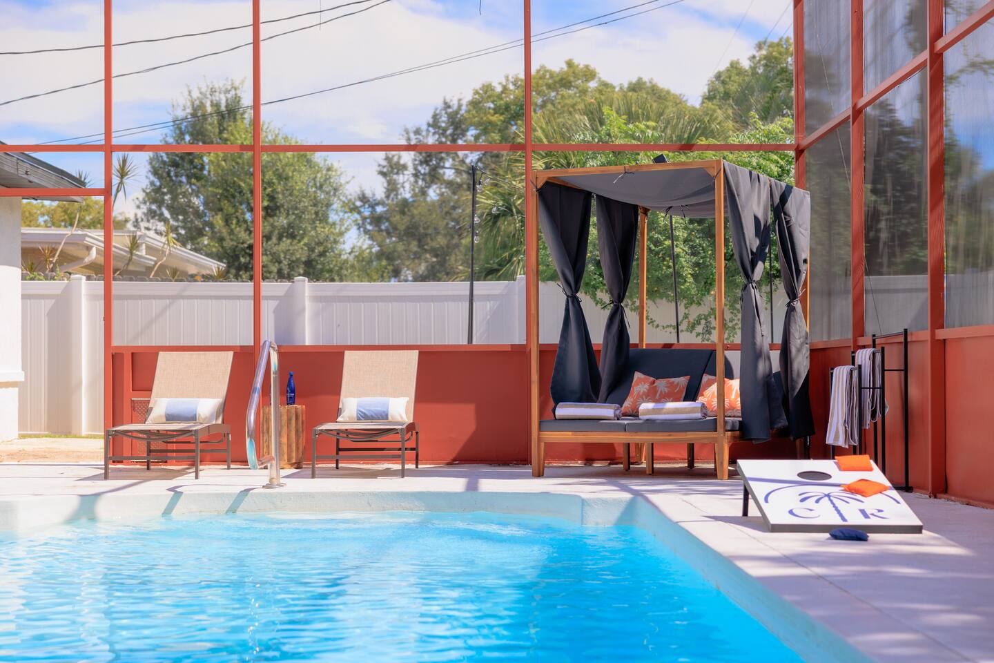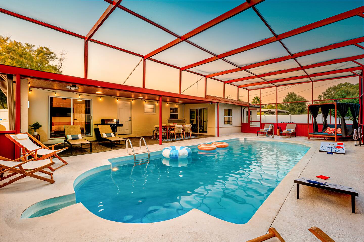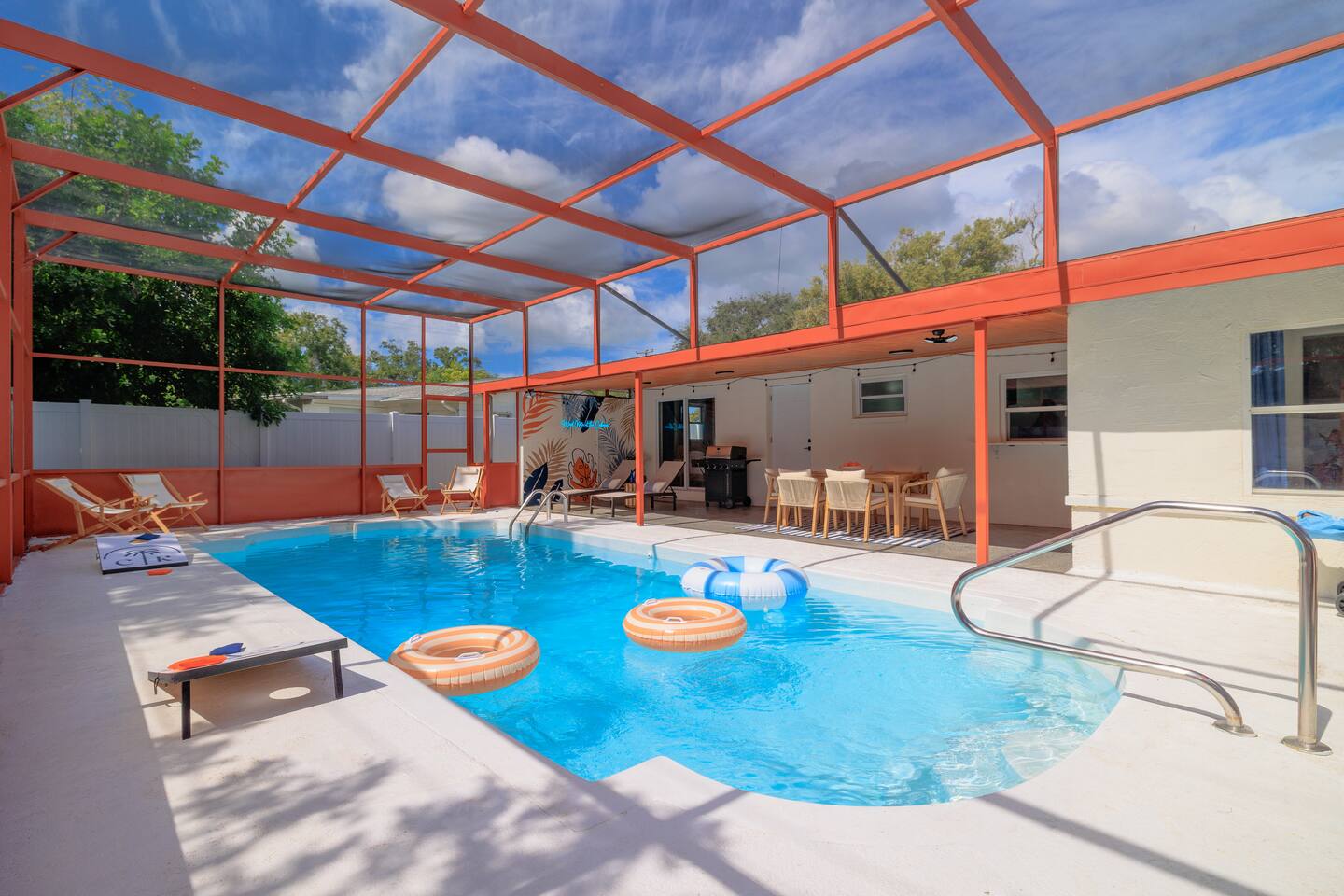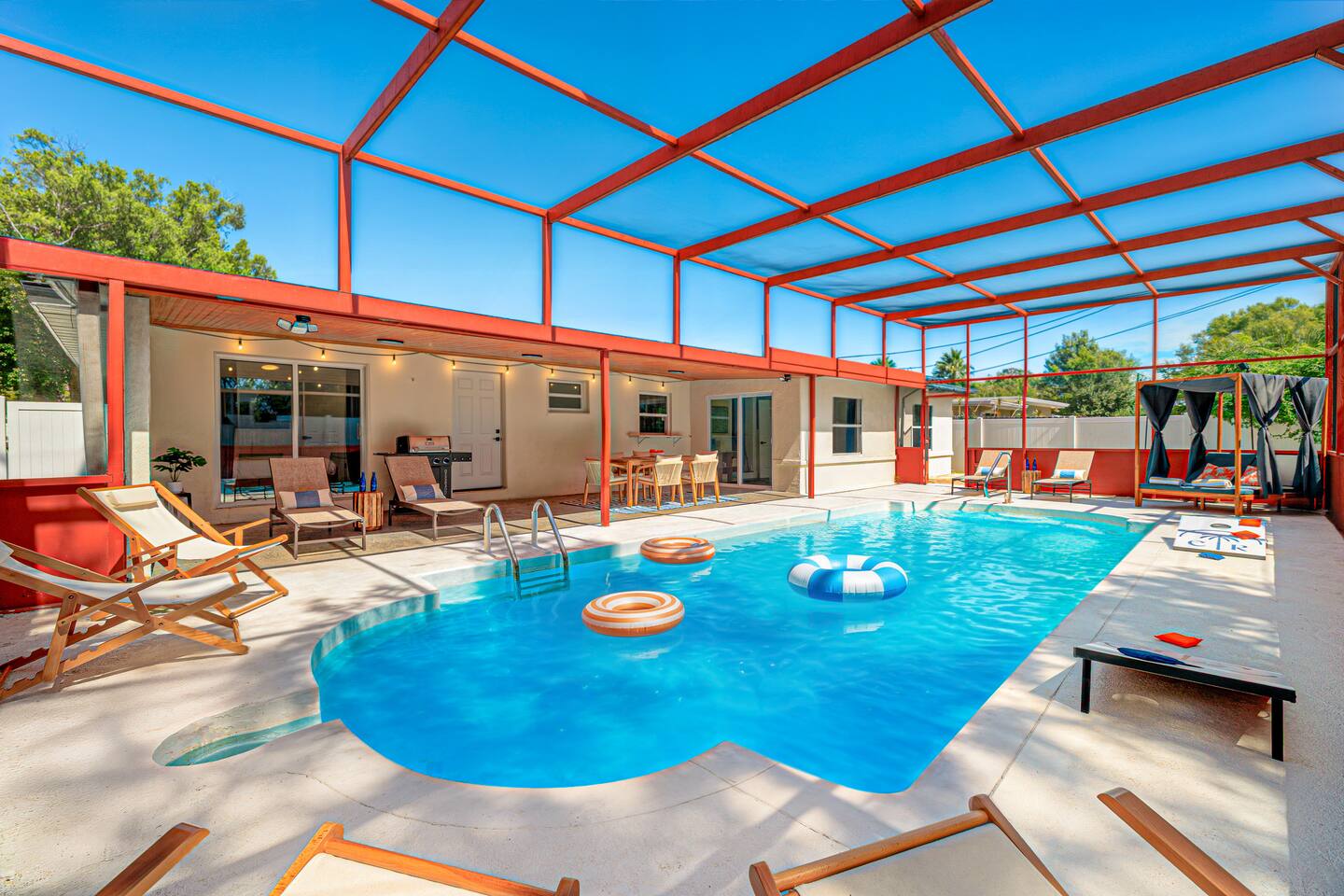 🏠 Property Highlights 🏠 *4 Bedrooms — 2 king, 1 queen + 2 bunk beds *3 Bathrooms — Modern fixtures, stocked with essentials *Fully Equipped Kitchen — Modern appliances, coffee bar, cookware essentials *Open-concept Living Room — Oversized sectional, 55” Smart TV *Epic Game Room — Foosball and air hockey table, TV, and comfortable seating *Indoor & Outdoor Dining Area — Perfect for family meals or game nights 🌴 Outdoor Highlights 🌴 *Private Pool — Sparkling blue water with cabanas and lounge chairs *Spacious Backyard — Fully fenced for privacy & outdoor fun *Outdoor Grill & Dining — Perfect for BBQ nights under the stars *Mini Putt-Putt — Fun for all ages ⛳ *Cabanas + Loungers — Relax, tan, and unwind in style *Fully Fenced Yard — Ideal for families & extra privacy 🧸 Family-Friendly Features 🧸 *Playroom — Ball pit, toys, games, and tent *Cornhole *Giant Connect 4 *Beach wagon, umbrellas, and toys *Jenga *Firepit with cozy string lights 📍 Unbeatable Location 🏖️ 10 min → Indian Rocks Beach 🌆 15 min → Clearwater Beach 🏪 5 min → Shopping, groceries & restaurants ✈️ 30 min → Tampa International Airport ⚾ Close to parks, golf courses, and top attractions 🌟 Included Amenities 🚗 Free on-site parking 🖥️ High-speed Wi-Fi 🧼 Washer & dryer 🧴 Hand & dish soap ☕ Coffee station + fully stocked kitchen 🌡️ Central A/C & heating 🔐 Keyless smart entry for smooth check-in ✨ Why Guests Love It Here *Designed for families, couples, and groups *Ideal for vacations, remote work, & extended stays *Resort-style amenities + unbeatable location *Thoughtfully curated for comfort, fun, and unforgettable memories 👉 Book your stay at Coral Stone Retreat and experience the perfect blend of luxury, leisure, and Florida sunshine. 🌞🌴